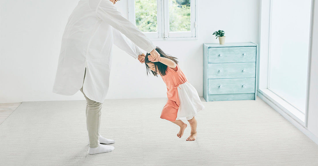 遊ぶ、走る、こける、寝る。そんな当たり前だけれど、愛らしい姿をあたたかく見守るために必要なのは、床を変えることでした。