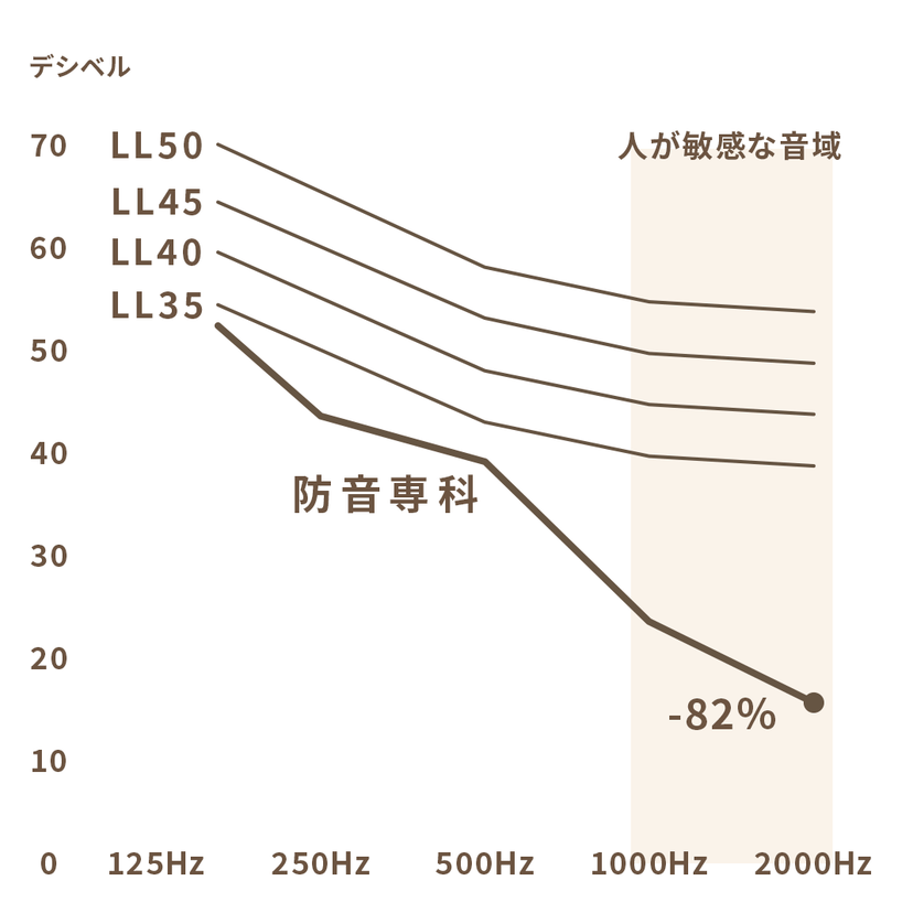 足音をはじめとする様々な音を最大限吸収し、特に人が最も敏感に反応する周波数帯と言われる2000hzでは最大82%の音を軽減できます。
