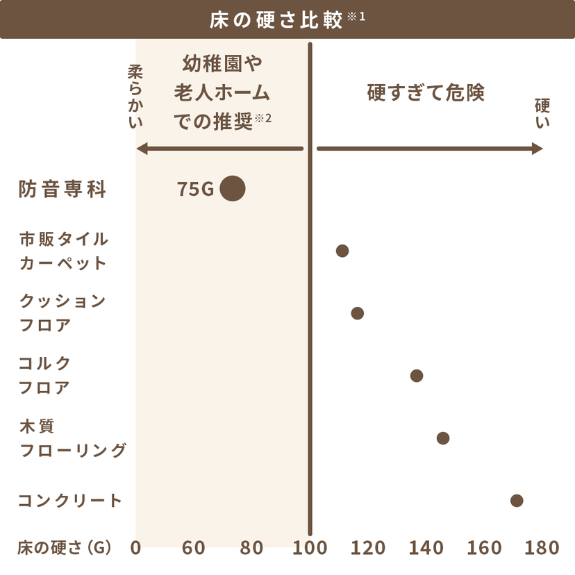 幼稚園や老人ホームで推奨される床の硬さ100G以下を余裕でクリアする75Gを達成。床材は柔らかすぎると足腰への負担が大きく歩きにくい。かといって硬すぎると、転倒の際に心配です。